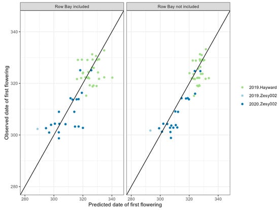 To examine whether spatial information could help to predict the within-orchard variation in the first flowering day, we analyzed the subset of orchards where row information was known. We focused on orchards that were repeatedly sampled over many years, as row information will reveal microsite differences. We therefore limited the data to one study orchard at Kerikeri (Orchard 4 as in Figure 2 and Table S1), where repeated measurements were carried out in 2013–2015 and 2018–2020. The models were rerun on this subset of data, including the spatial location within an orchard block, i.e., row and bay position. The model predictions were then compared with the test data, and we also compared the predictive accuracy of the models to the version with the same model but omitting the row and orchard interaction. The final model was cross-validated with the training data, and the prediction accuracy was assessed by comparison with the testing data.