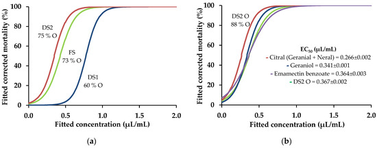 Sigmoidal curves fitted to the nematicidal activity of essential oils from FS, DS1, and DS2 against the pinewood nematode, with respective relative amounts of total oxygen (O)-containing compounds (a). For the oxygen-containing compounds fraction (DS2 O), nematicidal activity was compared to that of its main compounds, citral and geraniol, and the commercial nematicide emamectin benzoate (b). Half maximal effective concentration (EC50) values are shown for comparison purposes.