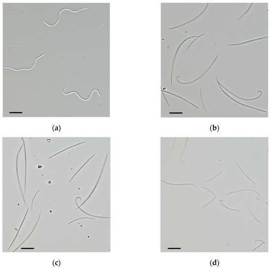 Microscopic detail of pinewood nematodes in control wells (a) and in wells with 1 µL/mL of geraniol (b), citral (c), or emamectin benzoate (d). PWNs killed by geraniol or citral showed a typical extended body shape (b,c), while those affected by emamectin benzoate showed a twisted body shape (d). Bar = 20 µm.