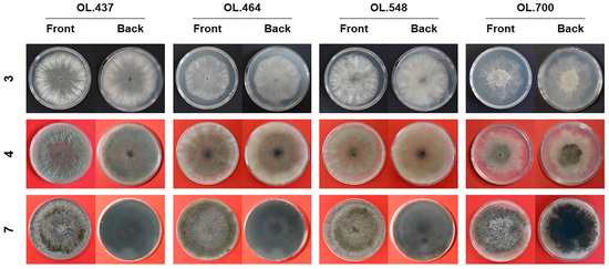 Growth of all isolates was recorded at 5–35 °C in the PDA test. The lowest growth rate was at 5 °C. With temperature rise, a progressive increase in growth was recorded, getting the highest value at both 25 and 30 °C (OL. 458 and 464), at 25 °C (OL.437) and at 30 °C (OL.700). A sharp decrease was recorded at 35 °C. In general, growth was significantly different among the different temperatures for each isolate; some significant differences were detected among the isolates at each temperature. In general, in the range of 15–35 °C, isolate OL.437 evidently showed the fastest growth rate. Growth was absent after an incubation at 40 °C for six days, but mycelium maintained the viability in all plugs. See Figure 5.