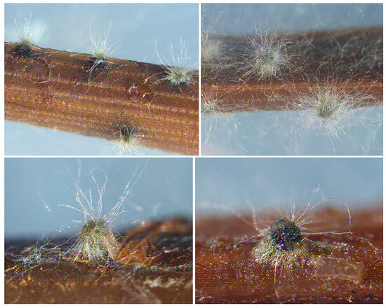 Conidiomata of the botryosphaeriaceous isolates under study, coated with hairy mycelium (developed on pine needles in water agar plates).