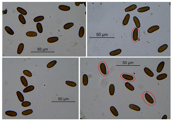 Conidia of the Diplodia seriata-like isolates under study. Conidia were observed after squashing the conidiomata which had been developed on pine needles; mucoid exudates were not observed; conidia circled in red clearly show that one side is more curved, and the opposite side is straighter.