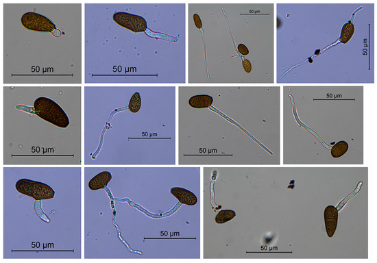 We observed germination from 6 to 24 h after setting up the aqueous suspension. Germ tubes emerged from one or both apical ends or along the conidium side specifically in sub-apical position or in the middle of the side. Most germinating conidia showed no septa, but very rarely one/two septa were observed (Figure 4).