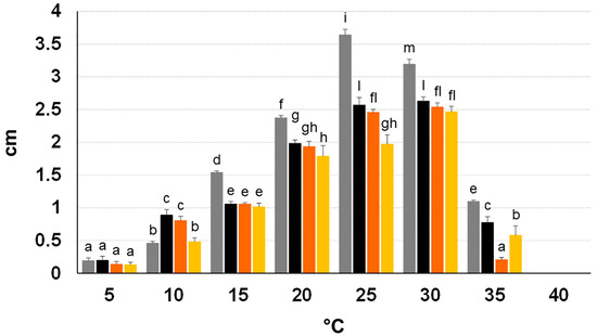Daily growth rates of the Diplodia seriata-like isolates under study (CREA-DC TPR OL.437 in grey, CREA-DC TPR OL.464 in black, CREA-DC TPR OL.548 in orange, and CREA-DC TPR OL.700 in yellow) on PDA at different temperatures. Different letters indicate statistically significant differences (p < 0.05). The bars indicate the standard deviation of the mean. At 40 °C no growth occurred, but mycelium of all isolates was still viable after a six-day incubation.