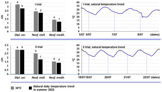 Growth rate of a Diplodia seriata-like isolate (CREA-DC TPR OL.437), Neofusicoccum stellenboschiana (CREA-DC TPR OL.431) and N. mediterraneum (CREA-DC TPR OL.427) at 30 °C (fast-growing temperature in vitro) compared with growth rate of the same fungi under the natural temperature trend occurring in July 2022. The bars indicate the standard deviation of the mean. Different letters indicate statistically significant differences (p < 0.05). In the first trial the I orange dot indicates the beginning of the trial, the II dot the final recording of D. seriata-like and the III dot refers to the recording of both N. stellenboschiana and N. mediterraneum; in the second trial, the I orange dot indicates the beginning of the trial, the II, III and IV dots refer to the final recording, respectively, of D. seriata-like, N. stellenboschiana, and N. mediterraneum (duration of the test was different for the different species due to their different growth rates).