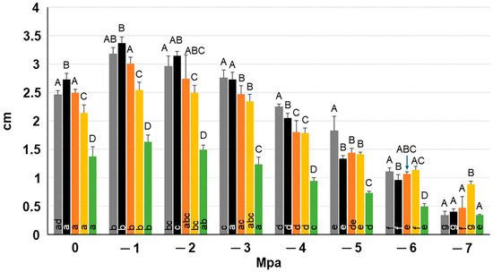 Daily growth rates of the Diplodia seriata-like isolates under study (CREA-DC TPR OL.437 in grey, CREA-DC TPR OL.464 in black, CREA-DC TPR OL.548 in orange, and CREA-DC TPR OL.700 in yellow) and N. mediterraneum (CREA-DC TPR OL.427) included for comparison (in green) on PDB amended with technical agar and different KCl doses to get different levels of water potential (Ψ measured in Mpa), at 25 °C. Different letters indicate statistically significant differences (p < 0.05). Uppercase letters at the top of the columns regard the comparison among the isolates for each value of Ψ. Lowercase letters at the base of the columns regard the comparison among the different Ψ for each isolate. The bars indicate the standard deviation of the mean.