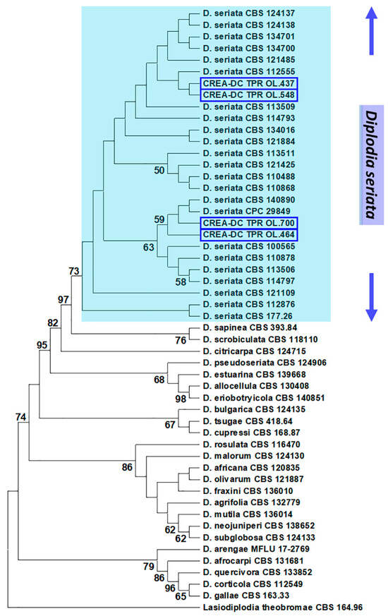 Phylogenetic tree of Diplodia species, based on ITS + TEF1-α + TUB2 data set and including the botryosphaeriaceous isolates from Salento (Apulia, Italy): CREA-DC TPR OL.437, 464, 548, 700. Diplodia seriata clade is shaded in blue-sky. The evolutionary history was inferred by using the Maximum Likelihood method and General Time Reversible model [45]. The tree with the highest log likelihood (−4846.06) is shown. The percentage of trees in which the associated taxa clustered together (bootstrap support value) is shown next to the branches only for values higher than 49%. The tree is drawn to scale, with branch lengths measured in the number of substitutions per site. This analysis involved 52 nucleotide sequences. There were a total of 1281 positions in the final dataset. Evolutionary analyses were conducted in MEGA X [46]. The arrows and the azure-shaded area highlight the Diplodia seriata clade. The boxes highlight the Diplodia isolates under study.
