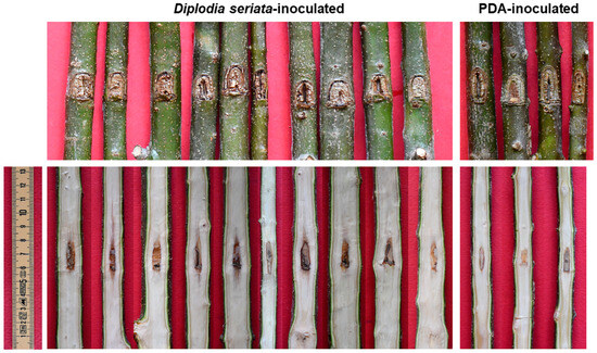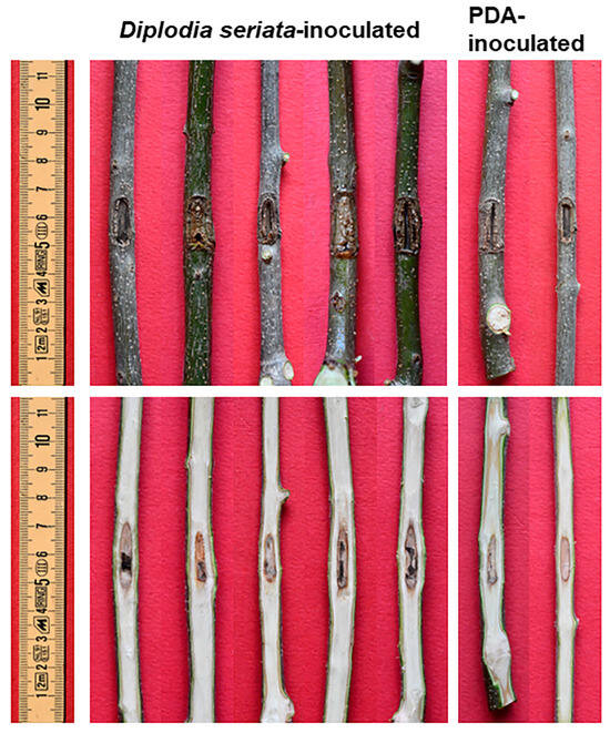 In Apulia (Italy), Carlucci et al. [55] tested, on grapevine, the pathogenicity of two isolates of D. seriata and eight additional Botrysphaeriaceae species—D. mutila, D. corticola, Do. sarmentorum, Do. iberica, B. dothidea, N. parvum, L. theobromae and L. citricola—all isolated from BD-affected grapevine in that area. It turned out that the isolates of D. seriata were the least virulent (together with D. mutila), whereas L. citricola, L. theobromae and N. parvum were the most virulent. This result was puzzling, as the isolation frequency of D. seriata from symptomatic vines was far higher than the other Botryosphaeriaceae species. Similarly, in Turkey, etiological investigation on BD-affected vines showed that D. seriata was weakly virulent, indeed the least virulent, when compared with the other Botryosphaeriaceae involved, N. parvum, B. dothidea, L. theobromae [56].