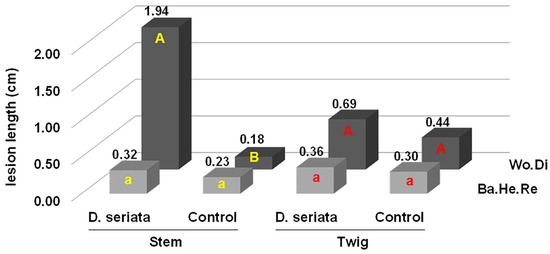 Graphic representation of the outcome of inoculations with Diplodia seriata (CREA-DC TPR OL.437) on stems and twigs of olive trees, cv Frantoio (Figure 9 and Figure 10). The length of the external healing reactions and of wood discolouration streaks are the net of the native inoculation wound. Ba.He.Re. = bark healing reactions, Wo.Di. = wood discolouration. Statistical analyses were conducted separately for bark (lower case letters) and wood (capital letters) and for stem (yellow letters) and twigs (red letters). Different letters indicate statistically significant differences (p < 0.01).