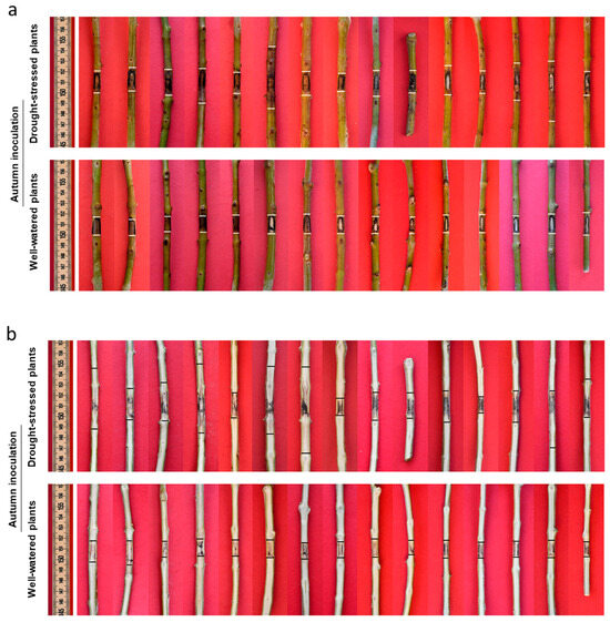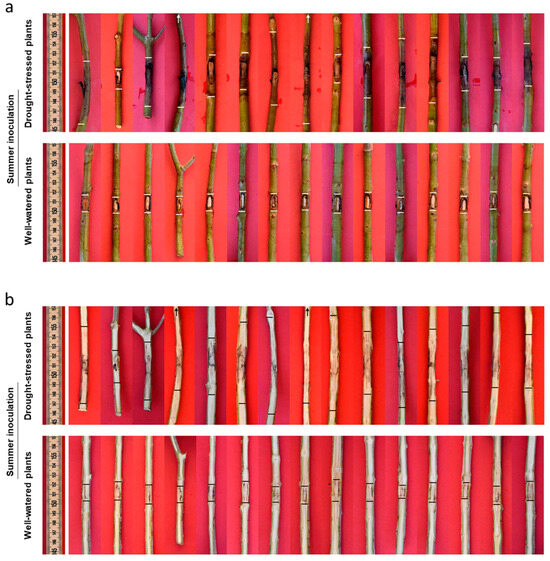 Outcome of inoculations with Diplodia seriata (CREA-DC TPR OL.437) of drought-stressed (DS) olive trees compared with those well-watered (WW). The test was conducted in summer over 35 days. (a) Bark necrosis in DS trees and bark healing in WW trees; (b) wood discolouration in DS and WW trees. The dashes define the lower and the upper limits of the lesions. The arrows indicate a spread of the necrosis beyond the limit of the figure.