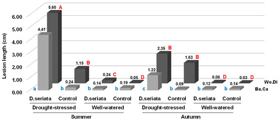 Graphic representation of the outcome of inoculations conducted in summer and in autumn with Diplodia seriata (CREA-DC TPR OL.437) (Figure 13 and Figure 14) on one-year-old twigs of drought-stressed (DS) olive trees, and compared with those well-watered (WW). The length of the external bark canker/healing reactions and of wood discolouration streaks are the net of the native inoculation wound. Externally, only D. seriata/DS/summer and D. seriata/DS/autumn showed bark canker; in the other treatments, the columns refer to bark healing reactions. Ba.Ca. = bark canker, Wo.Di. = wood discolouration. Statistical analyses were conducted separately for bark (lower case letters in azure) and wood (capital letters in red) and comparing all treatments. Different letters indicate statistically significant differences (p < 0.01).