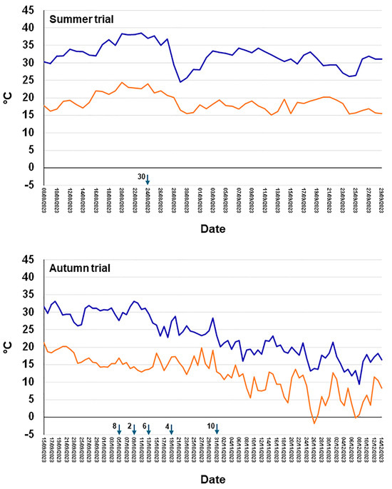 Minimum (curve in orange) and maximum (curve in blue) daily temperature trend occurring during pathogenicity trials conducted in summer and in autumn with Diplodia seriata (CREA-DC TPR OL.437) on one-year-old twigs of olive trees subjected to drought stress (DS) and compared with those well-watered (WW). Temperature recording was from the beginning of the interruption of water supply till the end of the trials when inoculated twigs were harvested and symptoms recorded. The arrows indicated the inoculation day(s) and the numbers beside them are the trees that were inoculated (half were DS, the other half were WW). Note that in the autumn trial inoculations were performed in a staggered order as soon as the trees showed the inoculation phenotype.