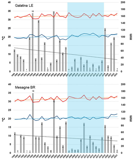 Meteorological trends, temperature and rainfall, over the last 35 years (1989–2023) in summer (July and August) in two different locations in Salento (Apulia, Italy). For each year they represent the average maximum (continuous red line) and minimum (continuous blue line) temperatures of the period July–August, as well as the total amount of the rainfall that occurred in the same period (grey bars, with numerical values representing the number of rainy days). The dashed lines are their trend lines. The azure-shaded area evidences the period of time (2007–2018) in which rainfall was constantly scarce in July–August, thus defining a prolonged period of drought.