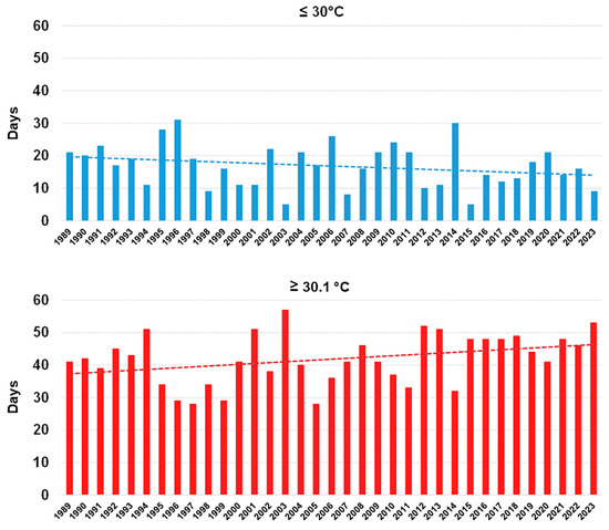 Number of days in which maximum temperatures reached values ≤ 30 °C and ≥30.1 °C in the period July–August in Galatina (LE) and in the time span 1989–2023. Dashed lines are the trend lines.