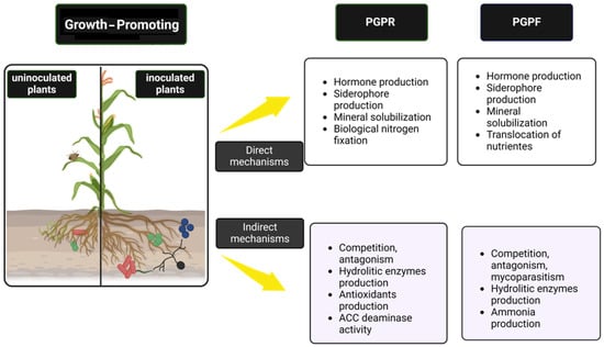 Direct and indirect mechanisms of PGPR and PGPF for plant growth promotion in the soil.
