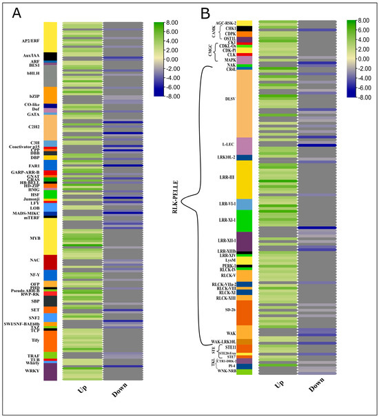To apprehend the regulatory roles of transcription factors (TFs) and protein kinases (PKs), we identified TFs from the protein sequences of differentially expressed genes. In plants, DNA transcription involves more than 1500 TFs to regulate target genes by binding with cis-regulatory elements in the promoter region [27]. Mapping the important transcription factors can provide insights into understanding the transcriptional regulation of the plant hormone genes in achieving enhanced biomass (Figure 5A, Supplementary file 2; Table S8). In this RNA-Seq data, a high proportion of TFs of 46 different families were differentially expressed between high and low biomass groups; for example, 45 WRKY, 16 TIFY, 38 NAC, and 18 GRAS family TFs were differentially regulated between high and low biomass groups. The over-representation of the WRKY transcription factors in the high biomass group showed the crucial roles in regulating genes accounting for assimilates accumulation and modulating the growth processes. Owing to their dual role, they can either mediate activation or act as repressors of target genes. For example, in rice, OsWRKY72, and OsWRKY77, they activate ABA signaling and repress GA signaling. Qiao and co-workers reported the direct role of WRKY in ABA signaling and drought-mediated regulation responses. Seven out of 45 WRKY TFs were downregulated in high-biomass groups, whereas 38 TFs were upregulated in high biomass [28]. All 16 TIFY were upregulated in the HB group, whereas 21 NAC TFs were downregulated among 38 differentially expressed TFs. Among 52 bHLH differentially expressed TFs, 6 were downregulated while 46 were upregulated in the HB group. bHLH TFs have a binding site for regulating MeJA inducible genes and are also reported to be transcribed in root apical meristem as a target of ARF5 downstream in the auxin signaling pathway [29]. Auxin-responsive TFs containing the B3 domain were also differentially expressed, and 12 out of 18 ARFs were upregulated in the HB group. Moreover, most members of HSF (Heat Shock Factors) were downregulated in the HB group, which shows the inactivated immunity and growth inhibitory processes responses.