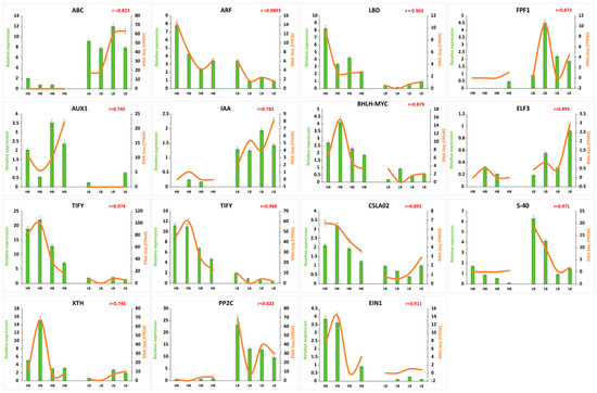 Confirmation of FPKM by qPCR expression. Green bars represent the relative expression in qPCR, and orange lines represent FPKM values in transcriptome for corresponding genes. Values on the y-axis indicate relative expression levels of qPCR (left) and RNA-Seq (right). Error bars show standard error of the means at (p < 0.05), and “r” is indicative of correlation between qPCR and FPKM expression values.