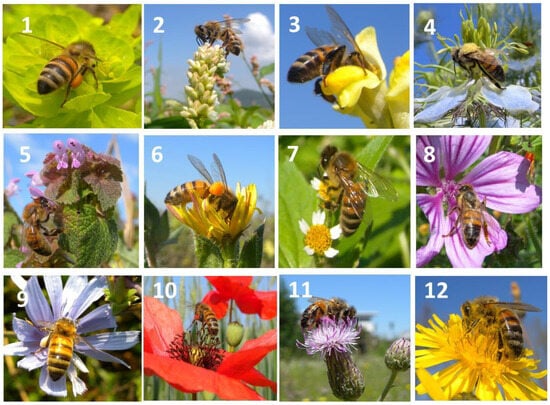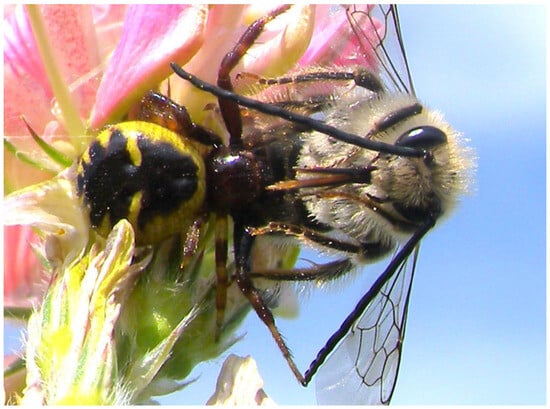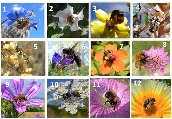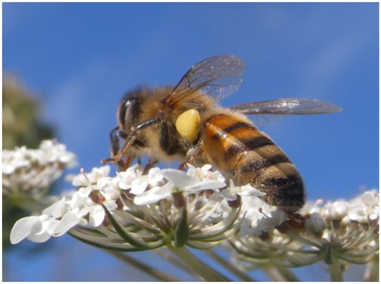 Among flower visitors, honeybees (Apis mellifera, Figure 1) and solitary bees (Figure 2) are predominant. Within the Mediterranean environment, solitary bees are represented above all by Andrenidae, Anthophoridae, Apidae, Melittidae, Colletidae, Halictidae, and Megachilidae []. The reward consists of nectar and/or pollen, with the latter being transported in different body places and after being packed in special pollen baskets situated on the insects’ legs. But it is rare for bees to collect both pollen and nectar simultaneously, as energy economy prompts bees to visit species with a predominance of one or the other reward []. Natural ecosystems have an abundance of wildflowers, which have typically evolved nectar production as a reward. On the contrary, the conventional agroecosystem has a predominance of species poor of nectar, so that insects are rewarded with pollen. For example, Papaver rhoeas, in spite of their flower appearance, has no nectaries, and pollen is the only food source for pollinators, the latter being indispensable for seed set as this species is completely self-incompatible [].