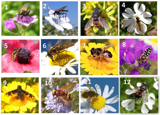 A less important, but still underestimated, role is played by Diptera (Figure 3) (overall Syrphidae, Tachinidae, Sarcophagidae, and Bombyliidae) []. In Bombyliidae, on the other hand, the mouthparts appear to have evolved to allow utilization of nectar by means of a long proboscis that can penetrate inside small flowers []. Visits by Bombyliidae have been noted, above all, on flowers that would be difficult for other insects to reach due to their small and elongated floral calyx, as in the case of Gentianaceae (Centaurium erythraea and Blackstonia perfoliata), Campanulaceae (Legousia speculum veneris and Jasione montana), Lamiaceae (Lamium purpureum and L. amplexicaule), Primulaceae (Anagallis arvensis and A. foemina), and other species.