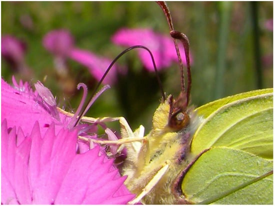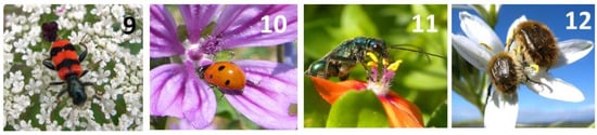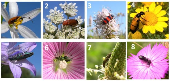 Some insects, above all, Lepidoptera, have a long proboscis that enables them to visit flowers with an elongated calyx even when the nectaries are hidden at the base of the calyx (Figure 4). Such insects include Lycaenidae, Pieridae and Sphingidae, Papilionidae, Nymphalidae, and Satyrids (Figure 5). Visits are frequent on flower species whose flowers have a particular shape, such as Dipsaceae (Knautia arvensis and Dipsacus fullonum) and Caryophyllaceae (Agrostemma githago, Lychnis flos-cuculi, Silene spp., etc.). However, pollen transport by butterflies is decidedly less efficient in comparison to bees []. Species belonging to the order of Coleoptera (Figure 6) are even less efficient, as such species, similarly to those of the order of Thysanoptera, often lack pollen transport specialization and appear to act more as pollen predators rather than potential pollinators []. Similarly poor efficiency is seen in ants, even though they are flower visitors of many species [], and this appears to be due to the low pollen germination after ant contact []. Their lack of hair and their very limited plant–plant movement on account of their inability to fly, at least in most species, suggests that these Hymenoptera are likely to be only occasional pollinators. Indeed, it was observed that ants may negatively affect plant fitness by reduced intensity of pollinator visits and that ants are repelled from flowers of many plant species (overall in tropical environments), although this repellence is clearly not ubiquitous [].