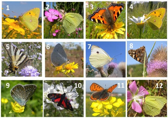 Lepidoptera observed on common wildflowers of the agroecosystem: 1 = Crysanthemum segetum, 2 = Dianthus carthusianorum, 3 = Crepis vesicaria, 4 = Anthemis arvensis, 5 = Cephalaria transsylvanica, 6 = Senecio erraticus, 7 = Cirsium arvense, 8 = Dipsacus fullonum, 9 = Ranunculus arvensis, 10 = Orlaya grandiflora, 11 = Sinapis arvensis, 12 = Lavatera punctata.