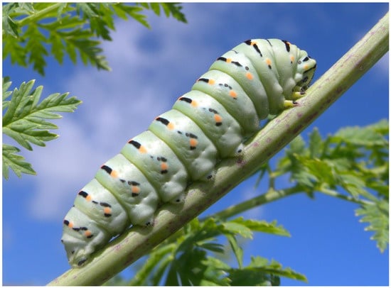 Caterpillar of the Papilio machaon butterfly specialized to lay eggs on plants of the Apiaceae family (in this case, the toxic Conium maculatum).