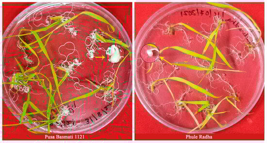 RRKN-infected plantlets of susceptible parent PB1121 and resistant parent PR in Petri dishes with PF-127 medium at 16 dpi (inoculum level-30 J2s per plant). The resistant parent PR showed a reduced number of hook-shaped galls (yellow-coloured arrows) when compared to the susceptible parent PB 1121. The galls have been highlighted by zooming up to 350%.