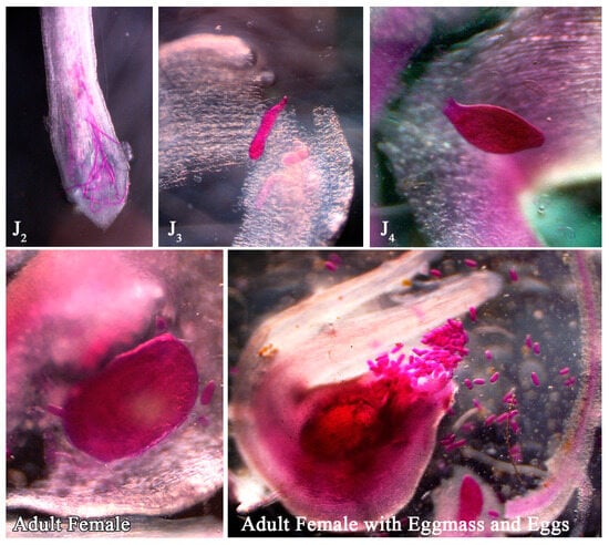 RRKN is an obligate sedentary endoparasite with second-stage juveniles (J2s) as the sole infective stage. J2s can penetrate roots through the elongation zone, root cap and injured root tips. Within a day of penetration, J2s penetrate the root cortex and orient their body parallel to the stele. Further, they travel through the cortical cell layers towards the apical meristem, where they begin feeding. After 42 h of invasion, J2s are found in the apical meristem area. Within 72 h of inoculation, hyperplasia and hypertrophy of root cortical cells referred to as giant cells occur, resulting in root-knots or galls around the nematode establishment site. Giant cells grow in the stellar region of the nearest metaxylem. The mechanical disruption caused by galls in metaxylem arteries interrupts water and nutrient intake, severely impairing root physiology and development []. This results in nutritional deficiency, leaf chlorosis, wilting, loss of vigour, reduced crop growth and yield losses [].
