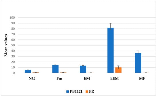 Assessment of RRKN infection in the parents PB1121 and PR in PF-127 media: the resistant parent PR produced significantly lower NG, Fm, EM and EEM, MF compared to the susceptible parent PB1121 (p < 0.01, Tukey’s HSD test).