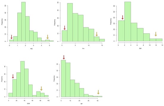 The population showed a nearly normal distribution for the traits NG, Fm and EEM with a moderate positive skewness; however, the traits EM and MF were highly positively skewed. Transgressive segregants on both sides were observed for the traits EM, EEM and MF; however, no transgressive segregants were identified for the trait Fm. For the trait NG, transgressive segregants were observed to exhibit a lower trait value (Figure 4).