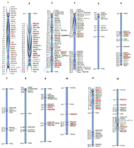 Chromosomal map depicting the physical positions of QTLs reported to be associated with RRKN resistance-related traits along with the markers used in the parental polymorphism survey. The markers that are polymorphic between PR and PB1121 are highlighted in red colour.