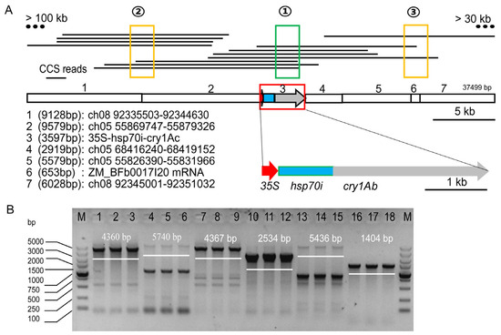 Researchers have used multiple approaches to analyze the exogenous insertion structure of MON810. Thermal asymmetric interlaced PCR (TAIL-PCR), Gateway (GW), and long-distance PCR (LD-PCR) were used to obtain the sequence structure of the insertion site and surrounding genomic region, which totaled ~5.3 kb [8,9]. The contig sequence of 14,016 bp was obtained by sequence capture and third-generation sequencing, and the foreign sequence was inserted at position 55879326 on chromosome 5 according to the previous report [8]. We note, however, that the surrounding genomic sequence is discontinuous with respect to the maize genome. Thus, one point remains to be clarified about the structure. The positions of the side sequences of 5′ and 3′ were far away, so it was obvious that the current insertion sequence information was missing. Therefore, the current flanking sequence was not obtained completely and confirmed boundary position information, suggesting that the side sequence may extend to a further position. Most of the current methods for developing transgenic plants incorporate foreign DNA into the plant genome, whether it is an Agrobacterium-mediated transformation or direct DNA transfer. Thus, the transgene–genome boundary region will be unique for each specific transformation event. Fortunately, there is a relatively accurate sequencing technique for obtaining long sequences—PacBio-Hifi which can avoid obtaining incorrect chromosomal positioning information by obtaining short sequence lengths [10]. The PacBio long-read long-sequencing system can accurately determine the correct sequence of the sample DNA by cross-referencing the copies of each molecule, which is known as cyclic consistency sequencing (CCS) [11].