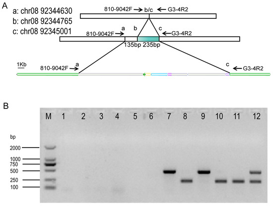 Allele-specific PCR (AS-PCR) was carried out with the indicated primers (Table 1). The 20 μL PCR reactions contained 1× Go Taq Green Master mix (Promega, Fitchburg, WI, USA), 100 nM each of forward and reverse primers, and 100 ng template DNA. PCR conditions were as follows: 5 min at 95 °C; 35 cycles of 30 s at 95 °C, 30 s at 62 °C, 30 s at 72 °C; and 3 min at 72 °C. Amplification products were sequenced to confirm the different genotypes. A total of 120 leaves were selected to identify the SNP using the AS-PCR-based construct-specific method.