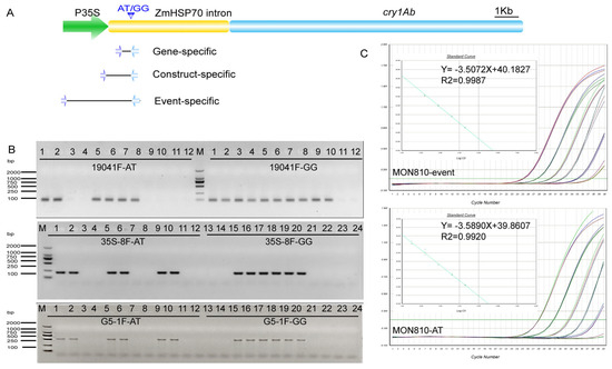 The specific-method-based AS-PCR for AT type: (A) There were primers designed for gene-specific, construct-specific, and event-specific detection methods of the AT type. (B) Identification of the AT and GG types. AT primers can detect not only homozygous AT types but also heterozygous AT/GG types, and similarly, GG primers can detect not only heterozygous AT/GG types but also homozygous GG types. (C) Quantitative standard curves of MON810 events and AT genotypes. DNA samples of AT-type homozygous MON810 were successively diluted to 100 ng, 10 ng, 5 ng, 1 ng, 0.1 ng, and 0.01 ng as the DNA template of the standard curve. The MON810 content was determined, and then the frequency of the AT type was determined relative to the MON810 content.
