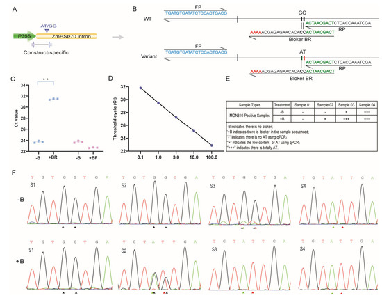 Therefore, this study not only obtained the correct full-length insertion structure of MON810 but also found the SNP located in the regulatory element region and established some methods for this SNP site suitable for different application scenarios. Direct Sanger sequencing using PCR amplification products can obtain high-precision sequence information, which was one of the precise methods. However, considering its low flux, this study had appropriately increased the efficiency of first-generation sequencing, which can obtain the sequence information of four samples in a single singer sequencing. If there were any changes in the four sequences, it can be observed through the peak map to further determine whether there was variation directly. For AS-PCR, this study conducted gene-specific, construct-specific, and event-specific methods to determine whether there was an “AT” variant type compared with the original sequences “GG” in the population of MON810 events. The AT mutations occurred in the hsp70 sequence, so gene-specific PCR was applicable to all events containing the hsp70 gene. However, construct-specific PCR has a higher specificity and is applicable to distinguish different constructs containing the same elements. In this study, it can be applied to the junction regions containing 35S promoters and hsp70, such as some events that have been commercialized, except for MON810, such as MON87411, MON87427, DBN9936, DBN9501, and NK603. The construct-specific detection method established can also detect whether there is an AT type in these events and could help clarify whether AT variation was a specific event occurring in the events or a common phenomenon in different events. On this basis, the event-specific method was vital to detect the AT type and determine whether it was the event MON810. It can even be used to detect the AT variation in MON810 in complex mixed samples composed of different events, and it is convenient for researchers or monitoring agencies because there is no need to carry out too much testing. Compared with other molecular diagnostic technologies used for the detection and quantitation of rare alleles from clinical samples, BDA was unique in simultaneously providing good mutation sensitivity, high mutation multiplexing, fast turnaround, and low reagent and instrument cost. Furthermore, in contrast to many proof-of-concept works in the academic literature showing high mutation sensitivity against one or a few mutations, this study established a BDA method to detect low VAF efficiently by blocking the WT sequences and enriching the variant sequences [30]. The method was established based on a construct-specific method, which was more accurate than gene-specific methods because it linked the p35S and the hsp70 regions that could distinguish whether AT type was present in events containing the same construct. In addition, the blocker overlapped the primer by 10 bp, and four “A” bases were added to the 3′ terminal of the blocker, which could effectively block the amplification of WT-type sequences and amplify low-frequency VAF. Importantly, BDA combined with Sanger sequencing can intuitively determine whether there was VAF as low as 0.1% in the samples to be tested, which was impossible for conventional methods. Thus, the method was an efficient and simple method to enrich low-frequency minority base variation.