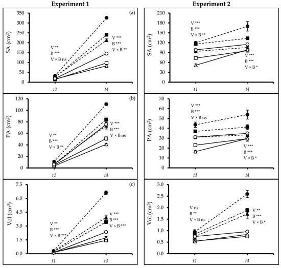 In both experiments, at all three harvest times, V3 produced the highest number of leaves (Exps. 1 and 2: t1, t3, t4: p ≤ 0.0000), branches (Exp. 1: t1: p ≤ 0.0008; t3, t4: p ≤ 0.0000; Exp. 2: t1, t4: p ≤ 0.0000; t3: p ≤ 0.0013), and leaf areas (Exps. 1 and 2: t1, t3, t4: p ≤ 0.0000). All varieties grown in soil with biochar had significantly higher numbers of leaves, branches, and leaf areas at all harvests (Figure 1b–d). A significant two-factor interaction was observed in Exp. 2 at t1, t3 and t4 (t1, t3, t4: p ≤ 0.0000). Consistent with the number of leaves and branches, V3 showed the positive effect of biochar addition by always producing bigger leaf areas. Importantly, at t4 biochar treatment enhances the number of leaves by 18% and 40% in Exp. 1 and 2, respectively. Similarly, plants grown with biochar produced bigger leaf areas than non-amended ones by 20% and 60% in Exp 1. and 2, respectively.