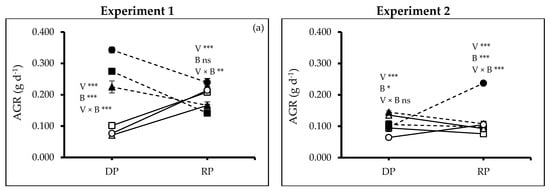 (a) Absolute growth rate (AGR), (b) panicle length (PL) and (c) number of subpanicles (NSP) of quinoa (Chenopodium quinoa Willd.) varieties treated without and with woodchip biochar. In each graph, different stars above and below the lines indicate significant differences among treatments (p ≤ 0.05, Tukey’s test). F-test significant at *—(p ≤ 0.05), **—(p ≤ 0.01), ***—(p ≤ 0.001). DP—drought period, RP—recovery period. White squares: quinoa variety 1 (V1) without biochar. Black squares: quinoa variety 1 (V1) with biochar; white triangles: quinoa variety 2 (V2) without biochar; black triangles: quinoa variety 2 (V2) with biochar; white circles: quinoa variety 3 (V3) without biochar; black circles: quinoa variety 3 (V3) with biochar; solid lines and grey filled bars—(B0) no biochar, dash lines and unfilled bars—(B2) 2% biochar.