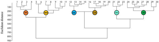 Classification dendrogram of normalized geochemical variables. The circles indicate six clusters, identified at Euclidean distance of about 300, corresponding to the lithological groups (FS: relatively felsic schists; MO: meta-ophiolites; OC: meta-ophicalcites; CS: calc-schists s.s.; TS: talc-schists; SS: serpentine-schists).