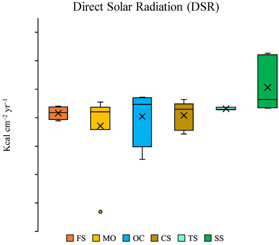 Box plots of direct solar radiation (DSR) in the six lithological groups. The box represents the 25–75 percent quartiles, the horizontal line is the median, the whisker indicates minimum and maximum values, the cross indicates the mean values, the circle indicates the outlier. FS: moderately felsic schists; MO: meta-ophiolites; OC: meta-ophicalcites; CS: calc-schists s.s.; TS: talc-schists; SS: serpentine-schists (SS).