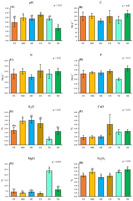 The soil pH differed among the lithological groups, with the SS soils being significantly more acidic than the CS and MO soils (Figure 3A). The K concentration was highest in MO, OC, and Cs; intermediate in FS and SS; and lowest in TS (Figure 3E). The Mg concentration was distinctly higher in TS (Figure 3G) and the Fe concentration was slightly higher in SS than in the other lithological groups (Figure 3H). The concentrations of C, N, P, and Ca were more or less the same in all lithological groups (Figure 3B–D,F).