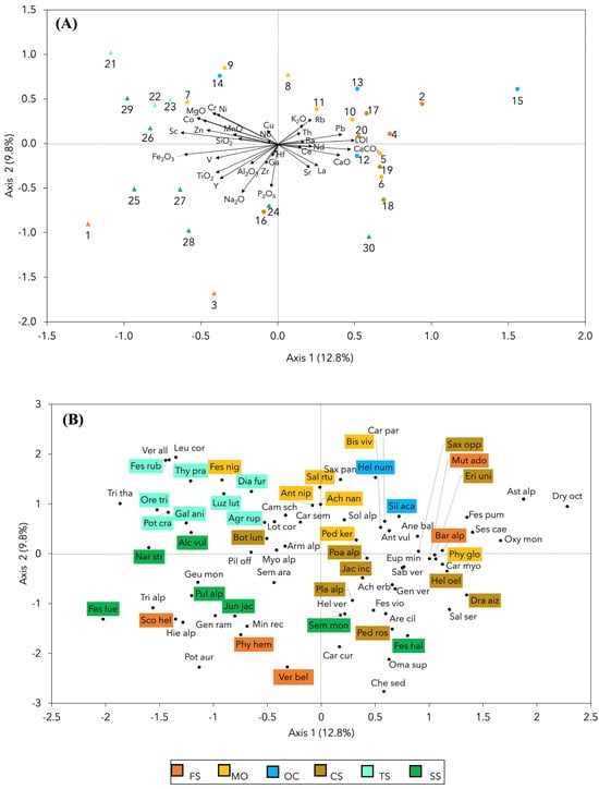Reciprocal ordination of vegetation and bedrock chemistry along the first two Canonical Correspondence Analysis (CCA) axes (percentage of variance accounted for each axis in parentheses). Top panel (A): biplot of 30 sampling plots and 32 geochemical variables. The plots are grouped by lithological groups with different colors as in the legend (FS: moderately felsic schists; MO: meta-ophiolites; OC: meta-ophicalcites; CS: calc-schists s.s.; TS: talc-schists; SS: serpentine-schists). Triangles indicate plots corresponding to serpentines s.l.; circles indicate plots corresponding to calc-schists s.l. based on binary classification in the field. Bottom panel (B): plot of 76 species. The indicator species of the six lithological groups are highlighted by colors as in the legend. Species abbreviations as in Table 2.