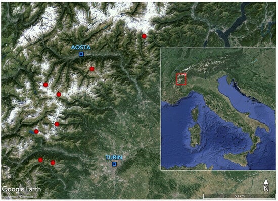 - Mainetti, A.; Ravetto Enri, S.; Lonati, M. Vegetation trajectories in proglacial primary successions within Gran Paradiso National Park: A comparison between siliceous and basic substrates. Ibex-J. Mt. Ecol. 2022, 14, 1–18. [Google Scholar]