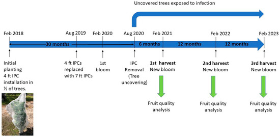 Timeline of experiment. Trees were covered with IPCs or left exposed for 30 months. Both covered and non-covered trees bloomed and set fruit for the first time 24 months after planting (February 2020). In August 2020, trees with IPCs were uncovered, exposing trees to psyllids. In February 2021, first yield and fruit quality assessment were conducted. These assessments continued for two more seasons.