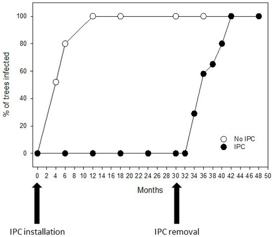Rate of HLB progression after IPC removal. White symbols represent non-covered trees, showing 80% infection by 6 months and 100% after 12 months. Black symbols represent trees that were covered with IPC for 30 months and remained non-infected during that time. Arrows indicate month of IPC installation and removal.