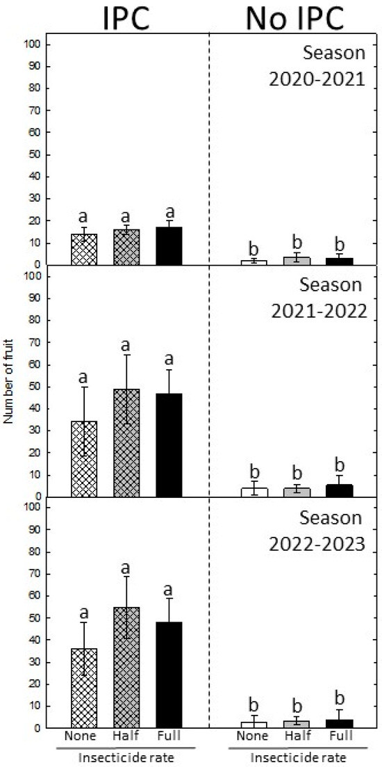 Number of fruits per treatment in every season. Values are means of 5 replications of 3 trees ± SD. Different letters indicate significant differences between IPC and non-IPC trees (p < 0.05).