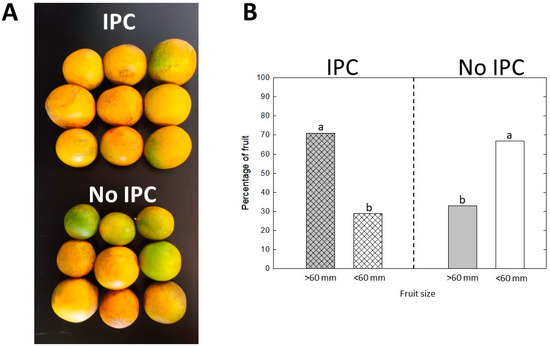 External fruit quality. (A) Fruits from IPC-covered trees and non-covered trees. Fruits are from trees 48 months after planting and 18 months after IPC removal (February 2022, second harvesting season). (B) Packout of fruit as if for the fresh market (average of second and third seasons). Fruits were divided into larger or smaller than 60 mm size classes. Values are average of two seasons’ data for means of 5 replications of 3 trees ± SD. Different letters indicate significant differences between IPC and non-IPC trees (p < 0.05).