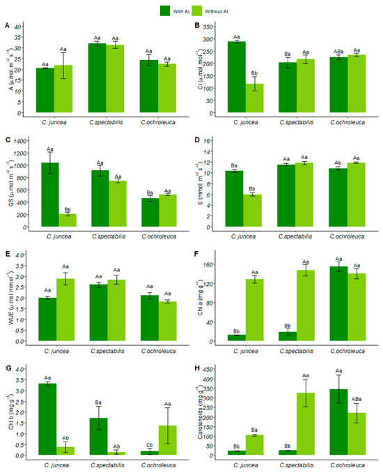 (A) Net photosynthesis (µmol CO₂ m²/s), (B) internal leaf carbon (µmol mol−¹), (C) stomatal conductance (mol H₂O m²/s), (D) transpiration (mmol H₂O m²/s), (E) water use efficiency (µmol CO₂ mmol H₂O−¹), (F) chlorophyll a quantification (mg·g−¹), (G) chlorophyll b quantification (mg·g−¹), (H) carotenoid quantification (mg·g−¹). Each species is represented by two columns, with dark green columns indicating soil with available aluminum and light green columns indicating soil with liming. Uppercase letters indicate the comparison of means between different plant species under the same soil conditions, while lowercase letters compare the means between soil conditions for each plant species.