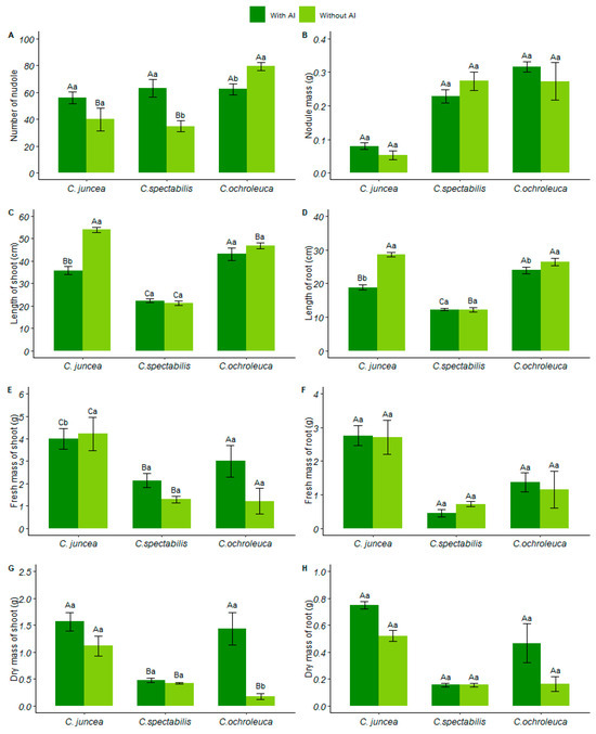 The data refer to the species of Crotalaria: (A) number of nodules, (B) nodular mass (g/plant), (C) length of the aerial part (cm/plant), (D) length of the root (cm/plant), (E) fresh mass of the aerial part (g/plant), (F) fresh mass of the root (g/plant), (G) dry mass of shoot (g/plant), (H) dry mass of root (g/plant). Each species is represented by two columns, with dark green columns indicating soil with available aluminum and light green columns indicating soil with liming. Uppercase letters indicate the comparison of means between different plant species under the same soil conditions, while lowercase letters compare the means between soil conditions for each plant species.