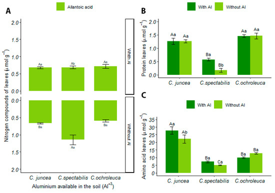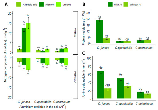 C. juncea had a higher concentration of ureides in nodules in soil with aluminum, with an 89% increase when compared to other Crotalaria species. Furthermore, when considering the soil condition, there was a 58% increase in production in soil with aluminum (15.01 ± 6.40) compared to soil with liming (6.25 ± 1.26) (Figure 5A).