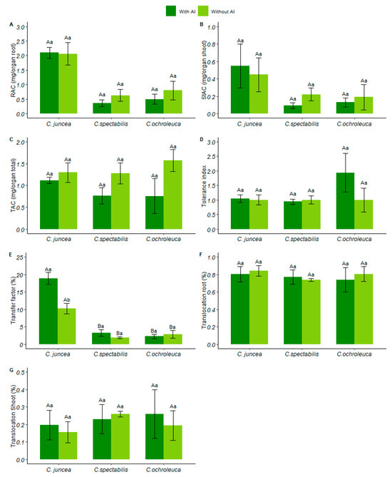 Species C. juncea (1.56 ± 0.39) and C. ochroleuca (1.43 ± 0.67) showed greater shoot dry mass in soil with aluminum, while C. spectabilis (0.48 ± 0.08) had a 30% reduction in relation to C. juncea. C. ochroleuca presented a higher dry mass in soil with aluminum than in soil with liming, indicating that aluminum positively influenced the dry mass of the shoot (Figure 3G).